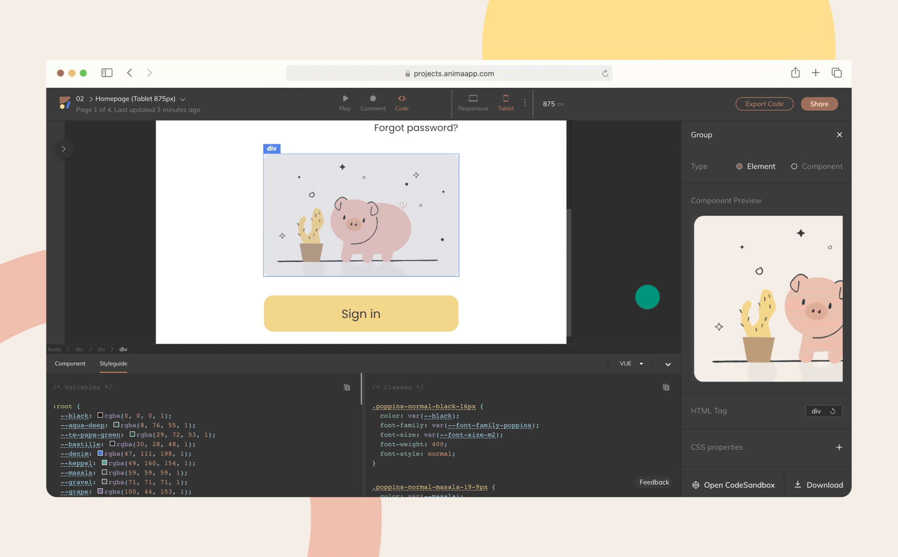 Start saving time and get HTML, Vue, and React code for designs in a matter of a click.